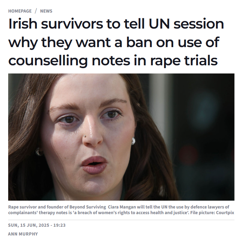 The UN Treaty Body ‘Committee on the Elimination of Discrimination against Women’ (CEDAW) has issued its concluding observations to the Irish Government after considering the eighth periodic reports of Ireland (CEDAW/C/IRL/8) at its 2156th and 2157th meetings, held on 20 June 2025. They write “Consolidate sexual offence laws based on consent and prohibit access to survivors’ counselling notes” 27 (d).