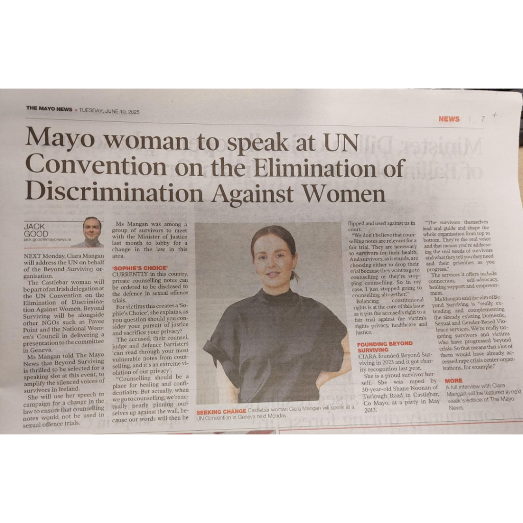 Beyond Surviving will be alongside other NGOs such as Pavee Point and the National Women’s Council in delivering a presentation to the committee in Geneva. They will use their speech to campaign for a change in the law to ensure counselling notes would not be used in sexual offence trials.