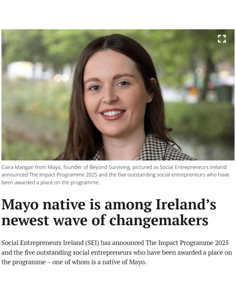 Beyond Surviving is ‘beyond’ thrilled to announce we have been selected as one of the five successful applicants to Social Entrepreneurs Ireland’s Impact Programme 2025. Beyond Surviving welcomes €20,000 in unrestricted funding with open arms, together with structured pro-bono expertise valued at an additional €20,000 to €30,000. We’re incredibly thrilled to avail of all the expertise, support, networks, and opportunities that this programme will offer over the next 9-months and beyond, helping us to scale our impact and drive lasting social change.